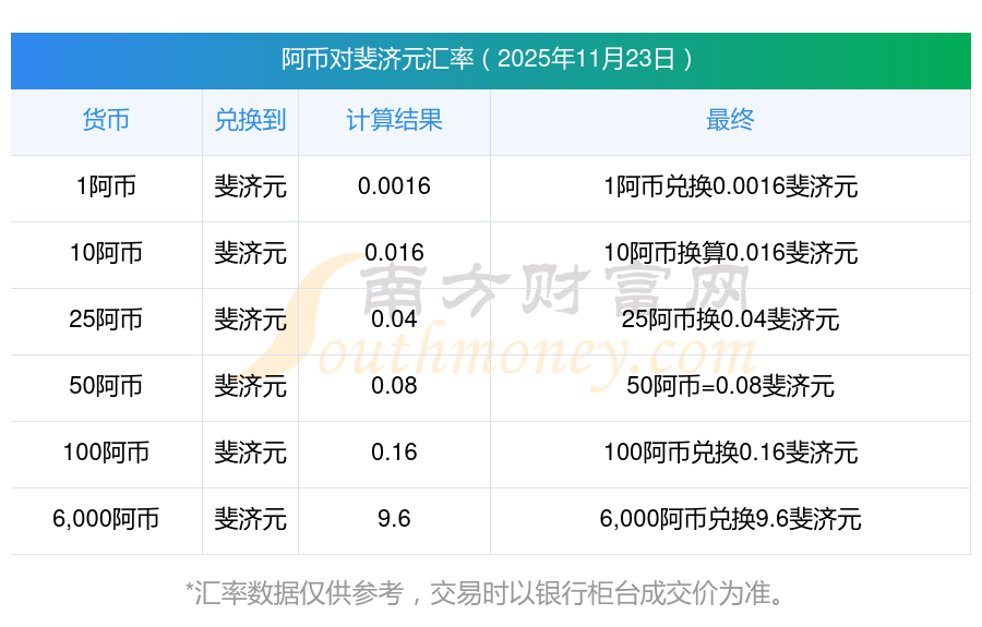 今天匯率:43阿幣兌換多少斐濟(jì)元的?(2025年11月23日)