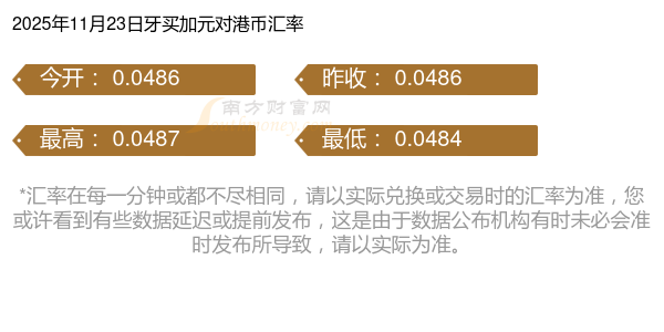 2025年11月23日牙買加元對港幣的匯率為:0.04864