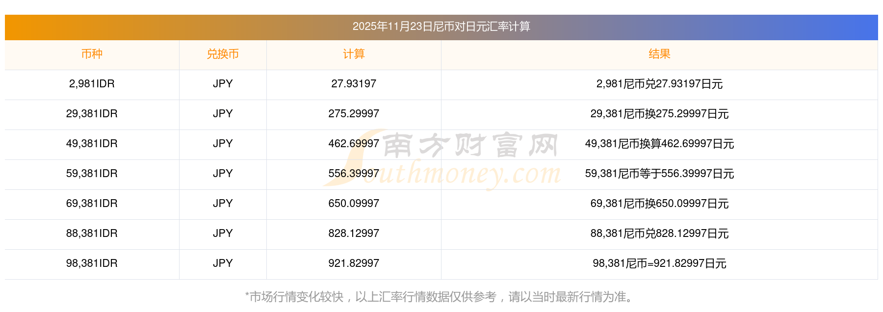尼幣兌換日元匯率查詢一覽表(2025年11月23日)