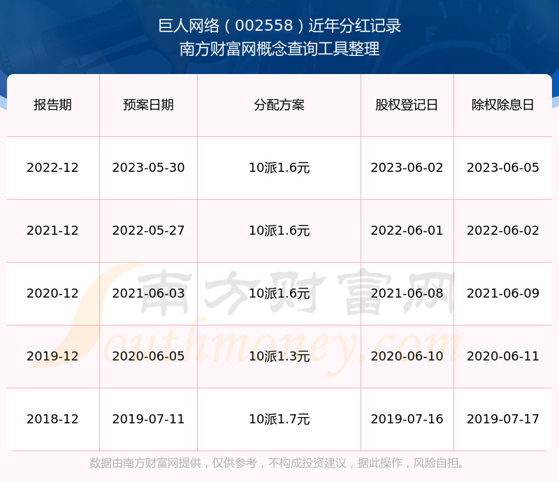 巨人網(wǎng)絡(luò)最新一次公布的分紅方案為10派1.6元。本次權(quán)益分派股權(quán)登記日為2023年6月2日,除權(quán)除息日為2023年6月5日,派息日為2023年6月5日。