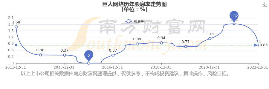 巨人網(wǎng)絡(luò)歷年股息率走勢如下圖: