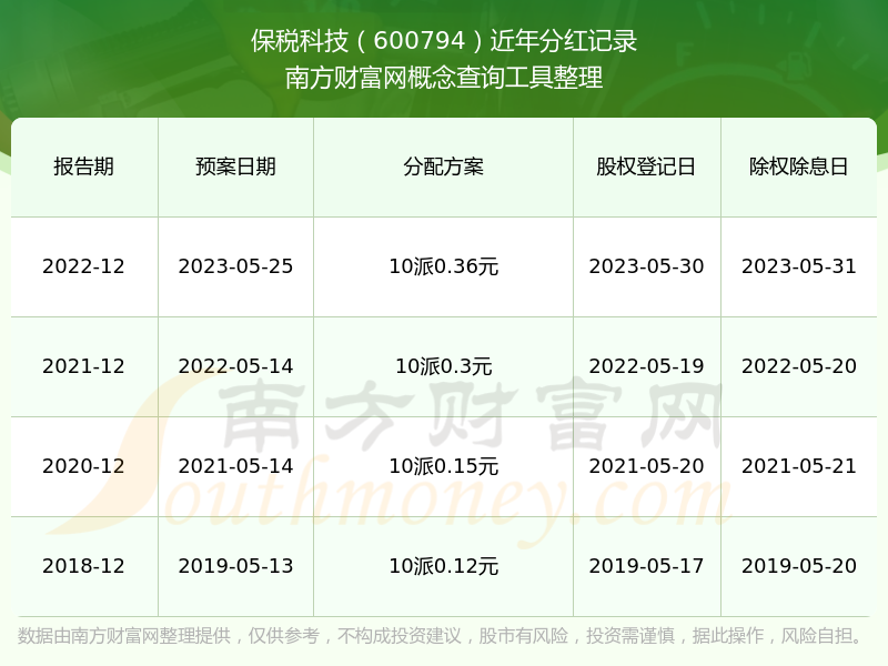 保稅科技最新一次公布的分紅方案:10派0.36元。