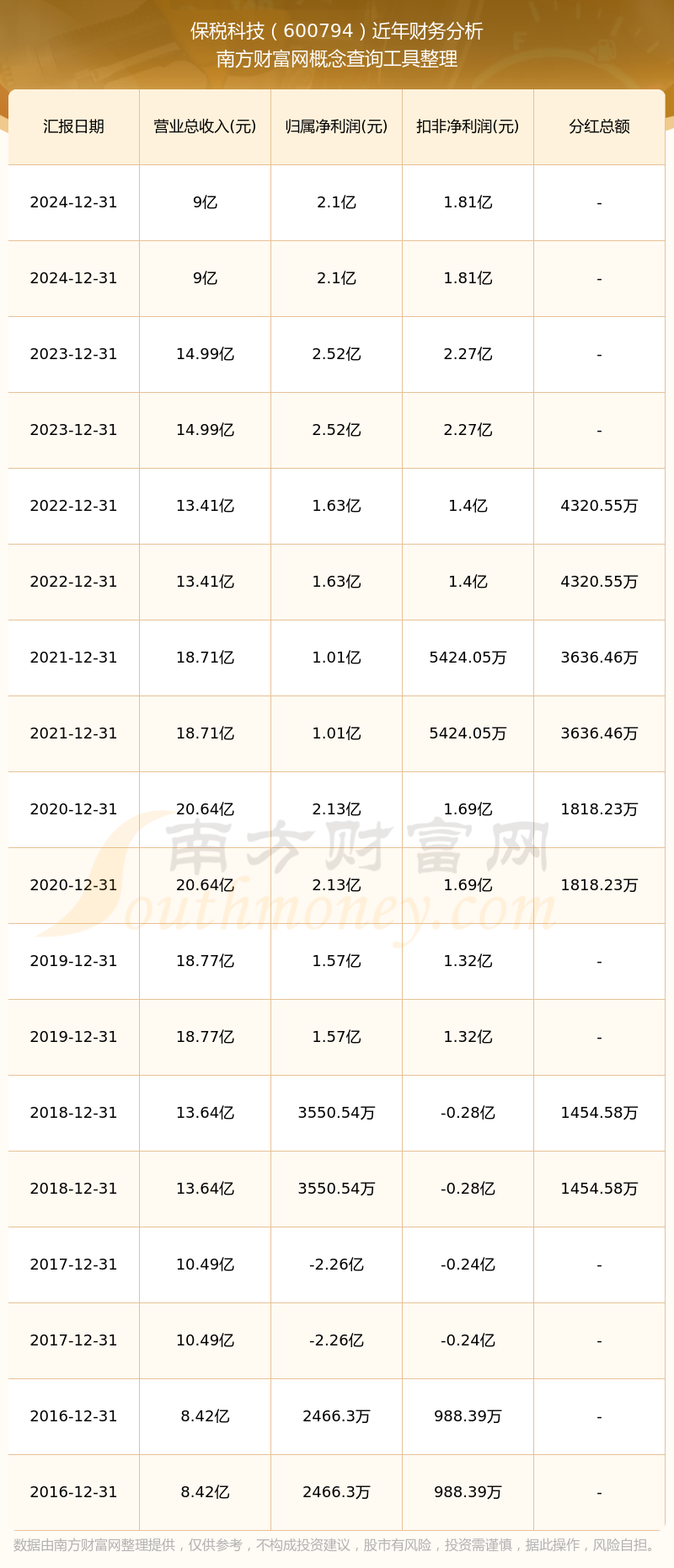 保稅科技公司2024年實現(xiàn)營業(yè)收入9億元,同比增長-39.96%;凈利潤2.1億元,同比增長-16.83%;毛利率45.8%。