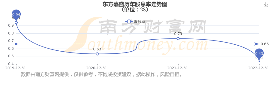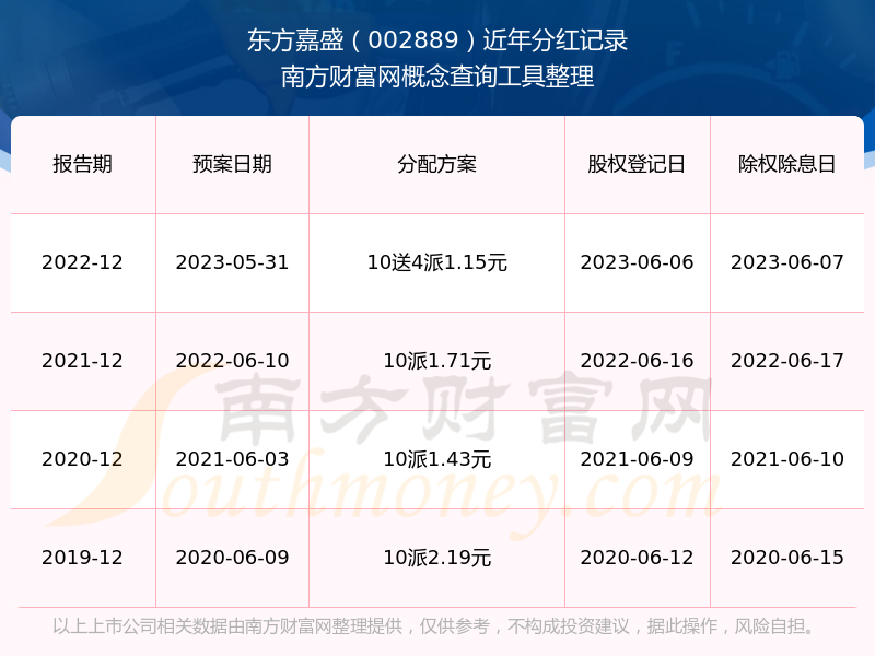 東方嘉盛最新一次公布的分紅方案為10送4派1.15元。本次權益分派股權登記日為2023年6月6日,除權除息日為2023年6月7日,派息日為2023年6月7日。