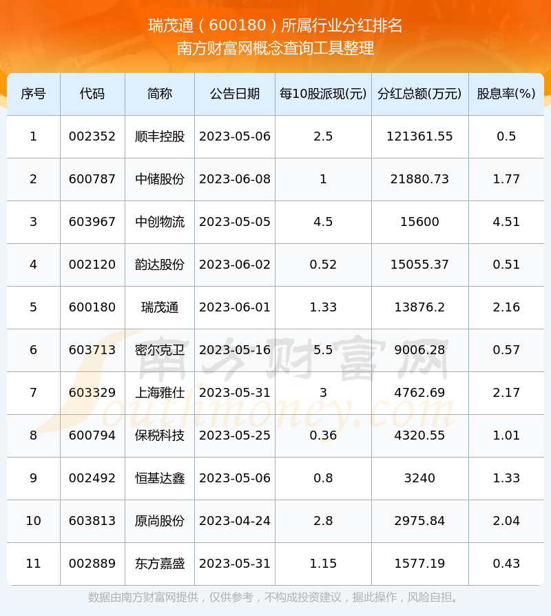 按照南方財富網趨勢選股系統(tǒng)統(tǒng)計,瑞茂通所屬行業(yè)為物流行業(yè)行業(yè),物流行業(yè)行業(yè)分紅排名情況如下表: