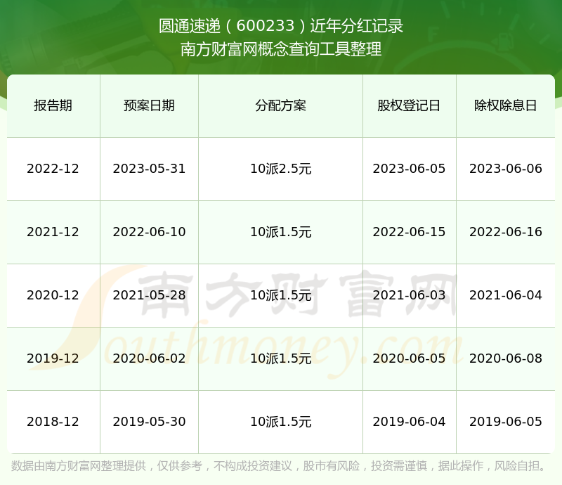 圓通速遞最新一次公布的分紅方案為10派2.5元。本次權(quán)益分派股權(quán)登記日為2023年6月5日,除權(quán)除息日為2023年6月6日,派息日為2023年6月6日。