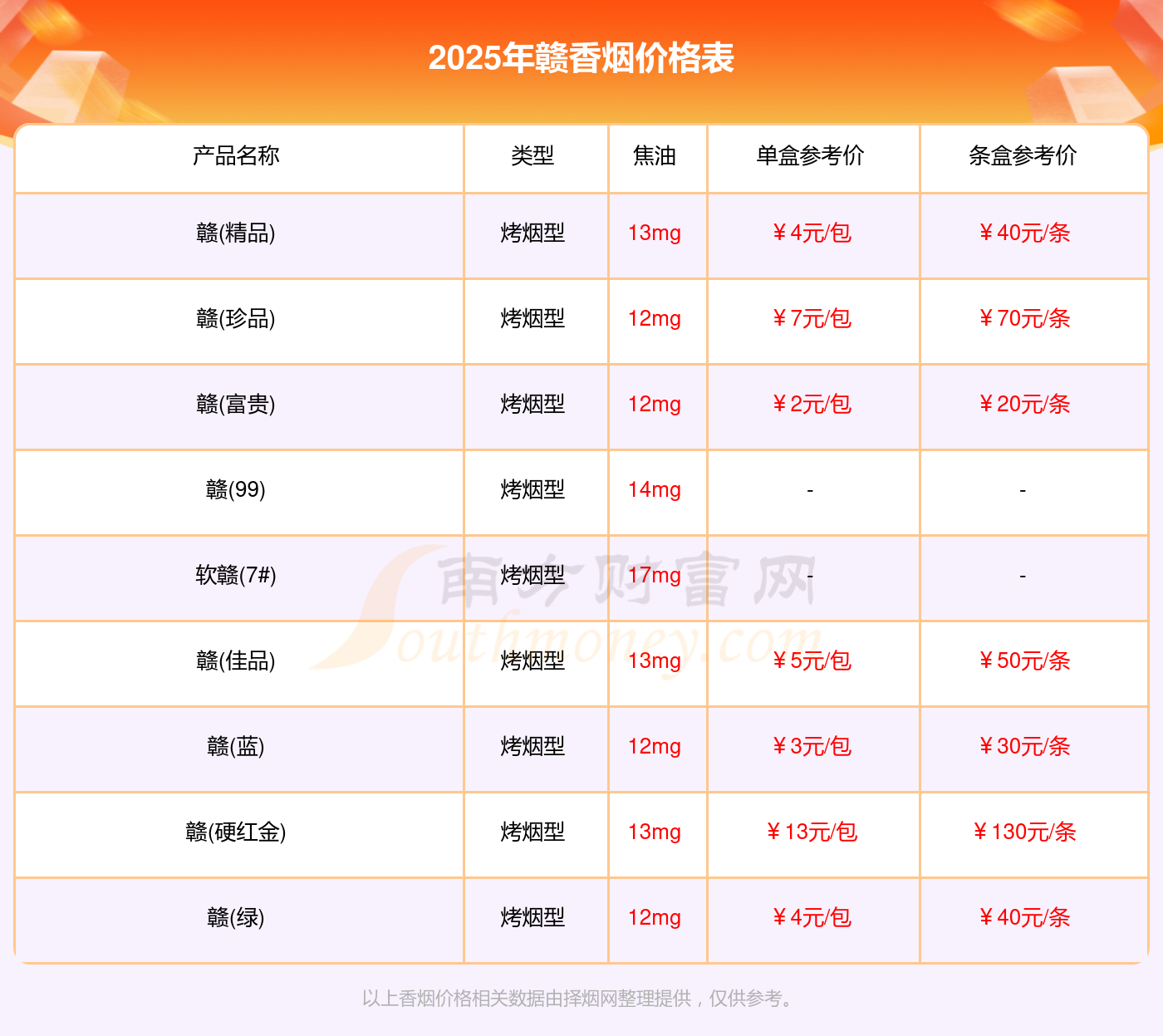 贛(硬紅金)參考價130.0元/條、贛(珍品)參考價70.0元/條、贛(佳品)參考價50.0元/條、贛(綠)參考價40.0元/條、贛(精品)參考價40.0元/條。