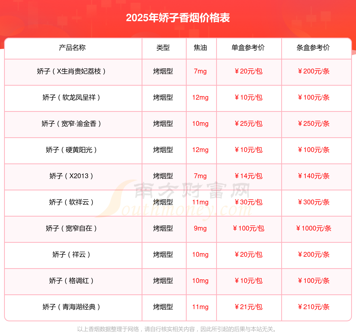 以上香煙數(shù)據(jù)整理于網(wǎng)絡(luò),請(qǐng)自行核實(shí)相關(guān)內(nèi)容,因此所引起的后果與本站無關(guān)。