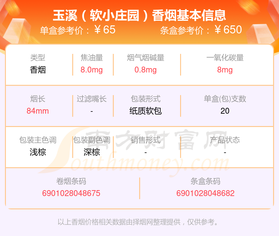 擇煙網(wǎng)為大家盤點(diǎn)了65元左右的玉溪香煙,有玉溪(軟小莊園)、玉溪(硬大成)、玉溪(莊園)細(xì)支、玉溪(100細(xì)支釣魚臺(tái))等,詳細(xì)價(jià)格如下: