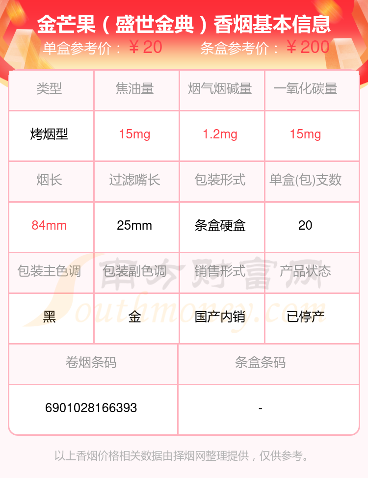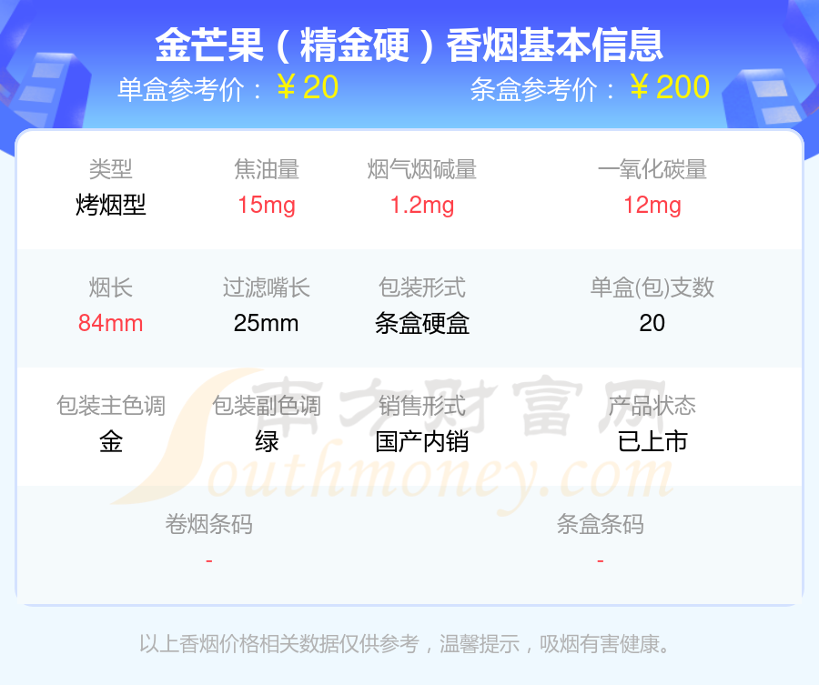 擇煙網(wǎng)為大家盤點了10元至40元的芒果香煙,分別有金芒果(精金硬)參考價20元/包、金芒果(盛世金典)參考價20元/包等。