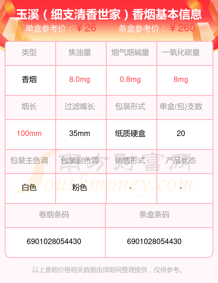 玉溪(細(xì)支清香世家)單盒參考價(jià):26元