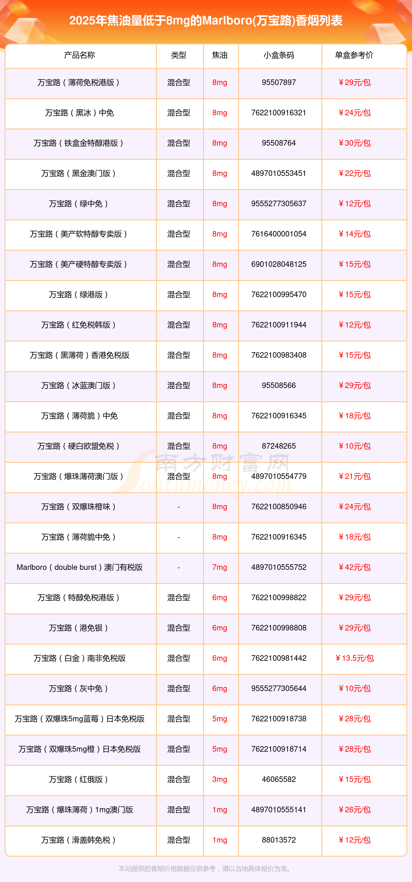 Marlboro(萬寶路)香煙焦油量低于8mg的煙查詢一覽