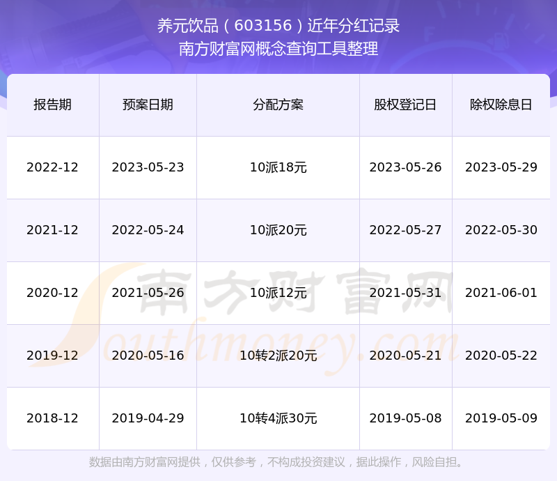 養(yǎng)元飲品最新一次公布的分紅方案為10派18元。本次權(quán)益分派股權(quán)登記日為2023年5月26日,除權(quán)除息日為2023年5月29日,派息日為2023年5月29日。