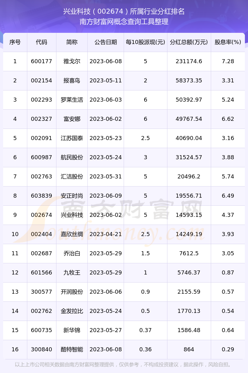 按照南方財富網趨勢選股系統(tǒng)統(tǒng)計,興業(yè)科技所屬行業(yè)為紡織服裝行業(yè),紡織服裝行業(yè)分紅排名情況如下表: