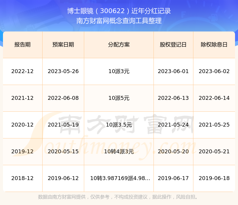 博士眼鏡最新一次公布的分紅方案:10派3元。