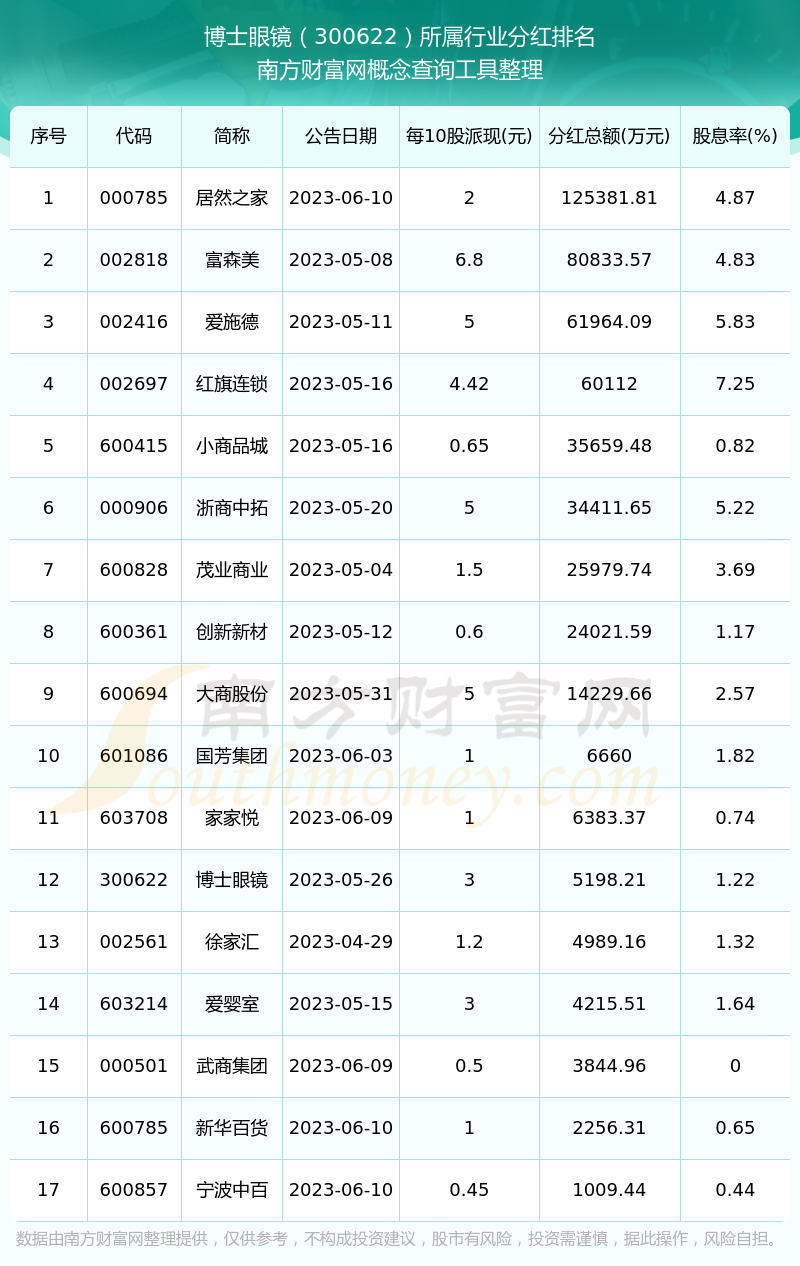 按照南方財(cái)富網(wǎng)趨勢選股系統(tǒng)統(tǒng)計(jì),博士眼鏡所屬行業(yè)為眼鏡行業(yè),眼鏡行業(yè)分紅排名情況如下表: