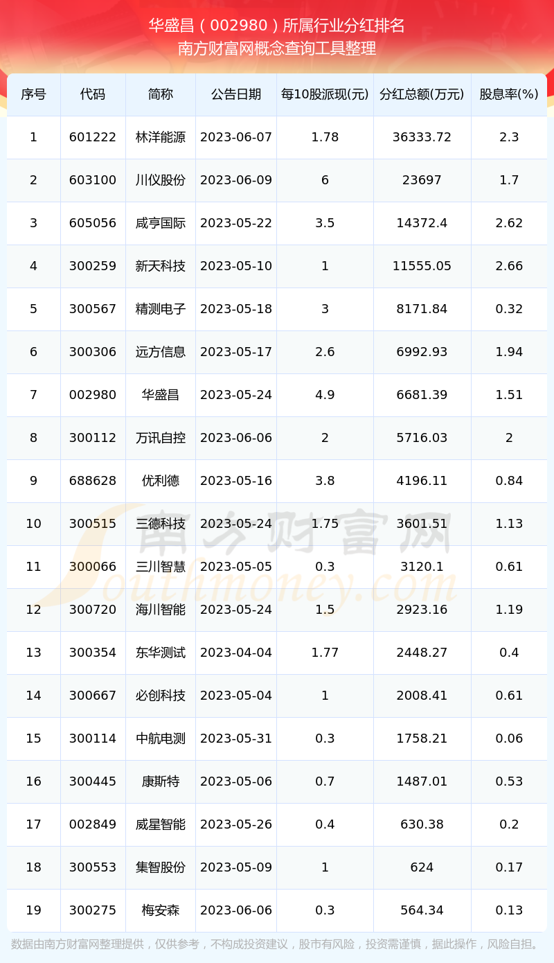 按照南方財(cái)富網(wǎng)趨勢(shì)選股系統(tǒng)統(tǒng)計(jì),華盛昌所屬行業(yè)為儀器儀表行業(yè),儀器儀表行業(yè)分紅排名情況如下表: