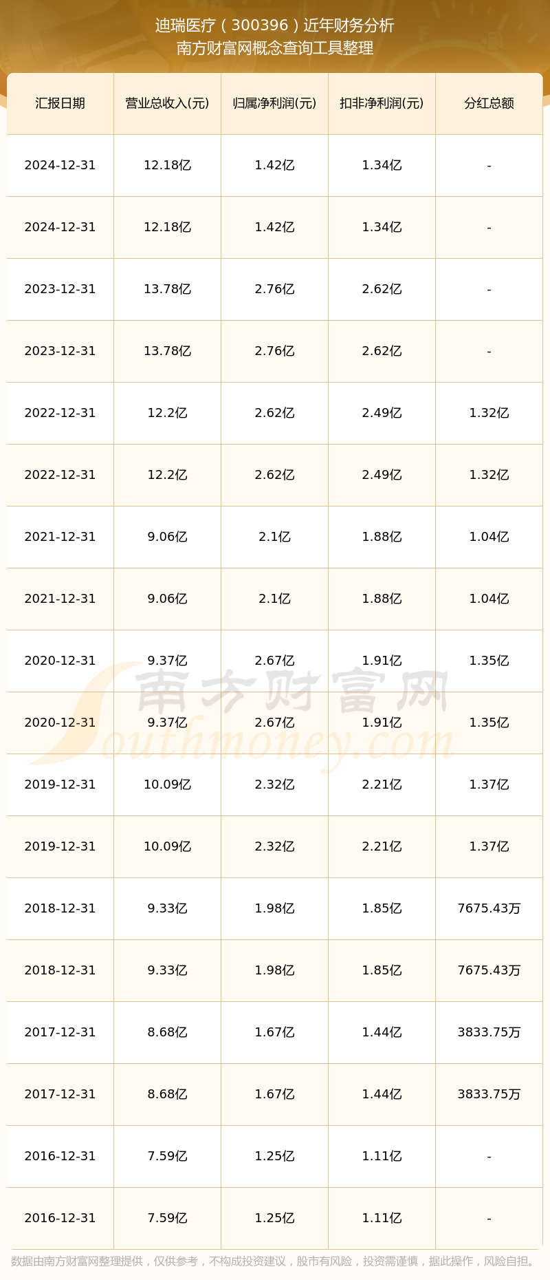 迪瑞醫(yī)療公司2024年實(shí)現(xiàn)營業(yè)收入12.18億元,同比增長-11.63%;凈利潤1.42億元,同比增長-48.5%;毛利率43.84%。