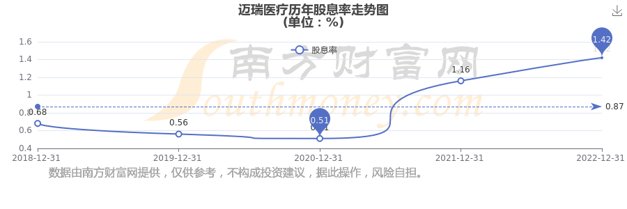 近年邁瑞醫(yī)療年度股息率走勢(shì)如下圖: