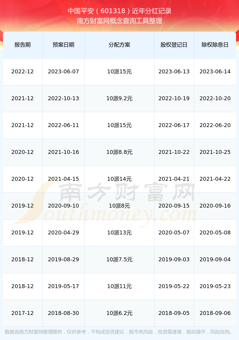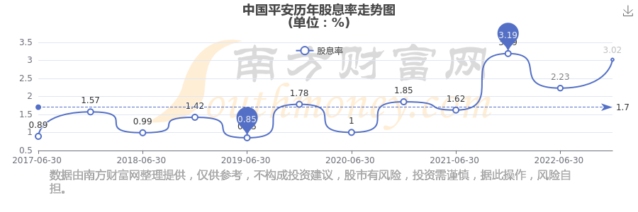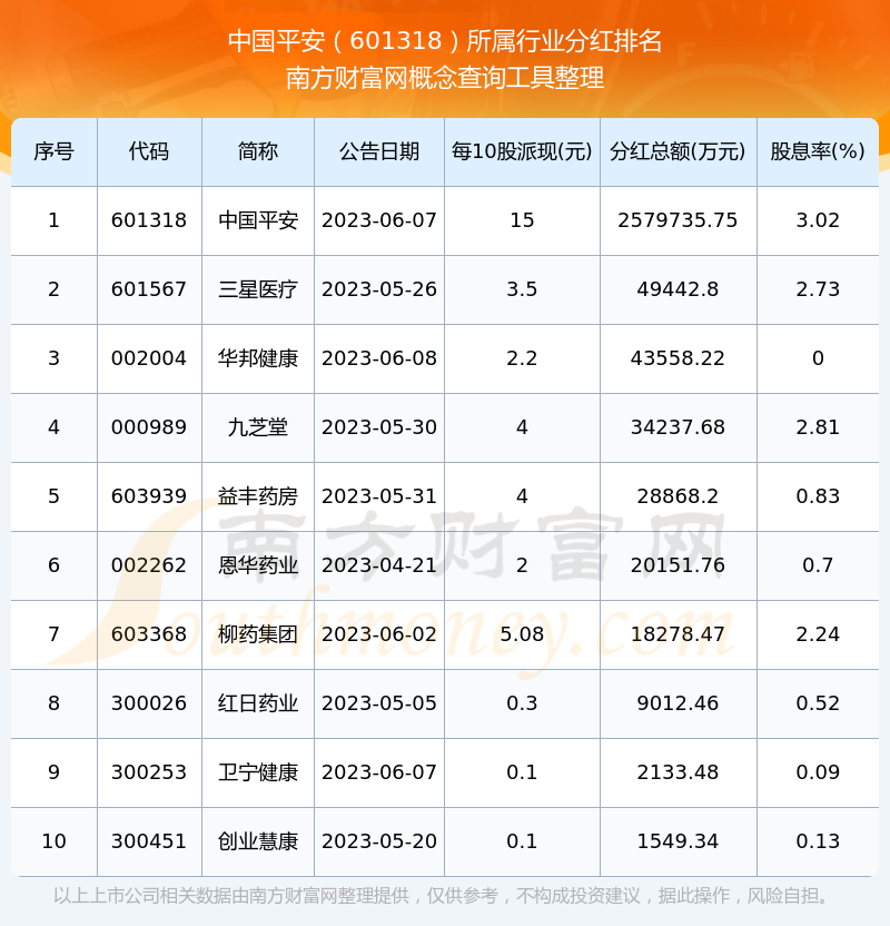 按照南方財富網(wǎng)趨勢選股系統(tǒng)統(tǒng)計,中國平安所屬行業(yè)為保險行業(yè),保險行業(yè)分紅排名情況如下表: