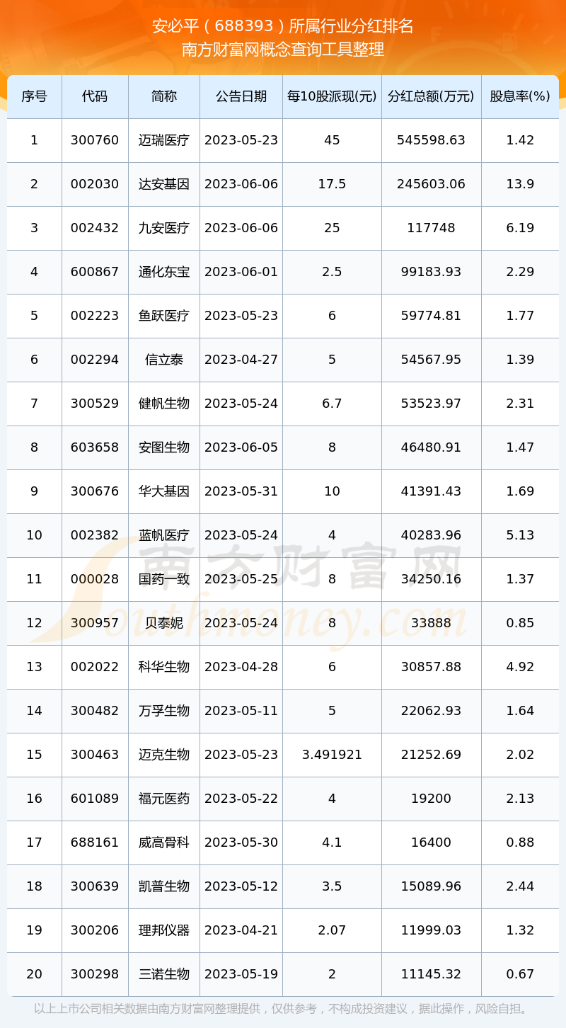 按照南方財(cái)富網(wǎng)趨勢(shì)選股系統(tǒng)統(tǒng)計(jì),安必平所屬行業(yè)為醫(yī)療器械行業(yè),醫(yī)療器械行業(yè)分紅排名情況如下表: