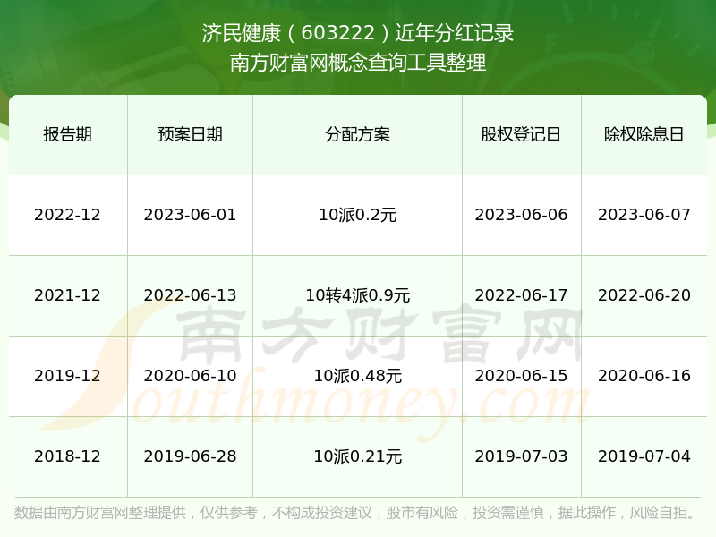 濟(jì)民健康最新一次公布的分紅方案為10派0.2元。本次權(quán)益分派股權(quán)登記日為2023年6月6日,除權(quán)除息日為2023年6月7日,派息日為2023年6月7日。
