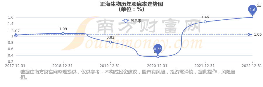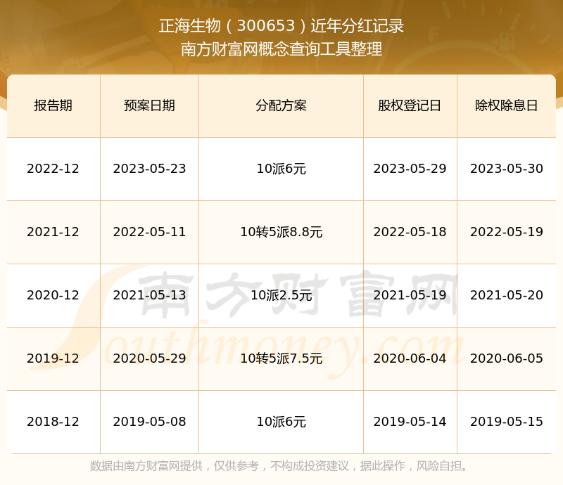 正海生物最新一次公布的分紅方案為10派6元。本次權(quán)益分派股權(quán)登記日為2023年5月29日,除權(quán)除息日為2023年5月30日,派息日為2023年5月30日。