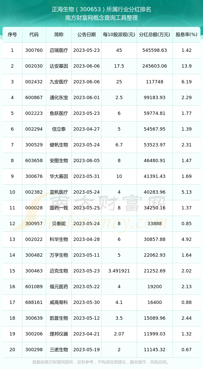 按照南方財富網(wǎng)趨勢選股系統(tǒng)統(tǒng)計,正海生物所屬行業(yè)為醫(yī)療器械行業(yè),醫(yī)療器械行業(yè)分紅排名情況如下表: