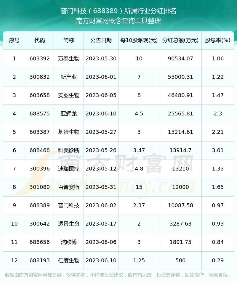 按照南方財(cái)富網(wǎng)趨勢(shì)選股系統(tǒng)統(tǒng)計(jì),普門(mén)科技所屬行業(yè)為體外診斷行業(yè),體外診斷行業(yè)分紅排名情況如下表: