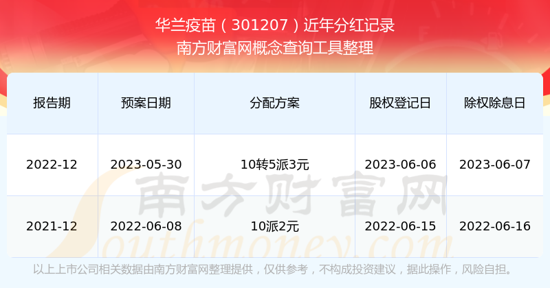 華蘭疫苗最新一次公布的分紅方案為10轉(zhuǎn)5派3元。本次權(quán)益分派股權(quán)登記日為2023年6月6日,除權(quán)除息日為2023年6月7日,派息日為2023年6月7日。