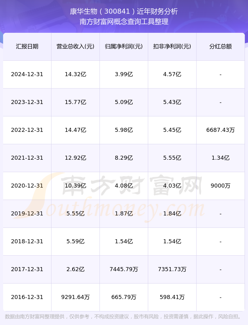 康華生物2024年總營收14.32億,同比增長-9.23%;凈利潤3.99億,同比增長-21.71%;銷售毛利率94.2%。