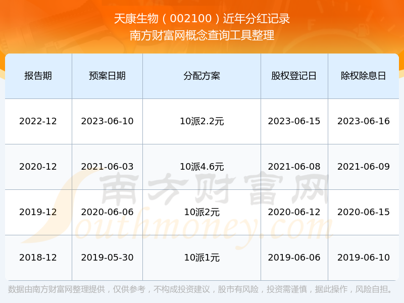天康生物最新一次公布的分紅方案為10派2.2元。本次權(quán)益分派股權(quán)登記日為2023年6月15日,除權(quán)除息日為2023年6月16日,派息日為2023年6月16日。