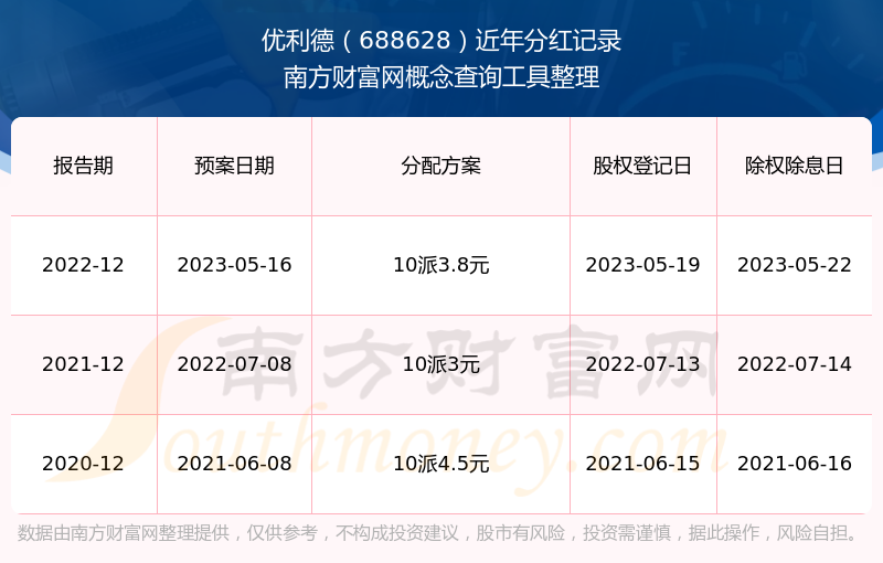 優(yōu)利德最新一次公布的分紅方案為10派3.8元。本次權(quán)益分派股權(quán)登記日為2023年5月19日,除權(quán)除息日為2023年5月22日,派息日為2023年5月22日。