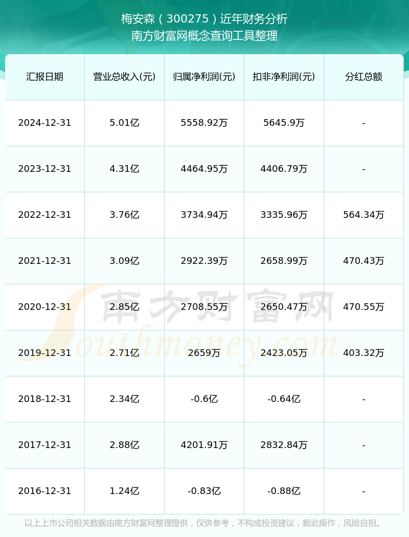 2024年報(bào)顯示,梅安森實(shí)現(xiàn)營(yíng)收5.01億,同比增長(zhǎng)16.05%;凈利潤(rùn)5558.92萬(wàn),同比增長(zhǎng)24.5%;毛利率39.65%。