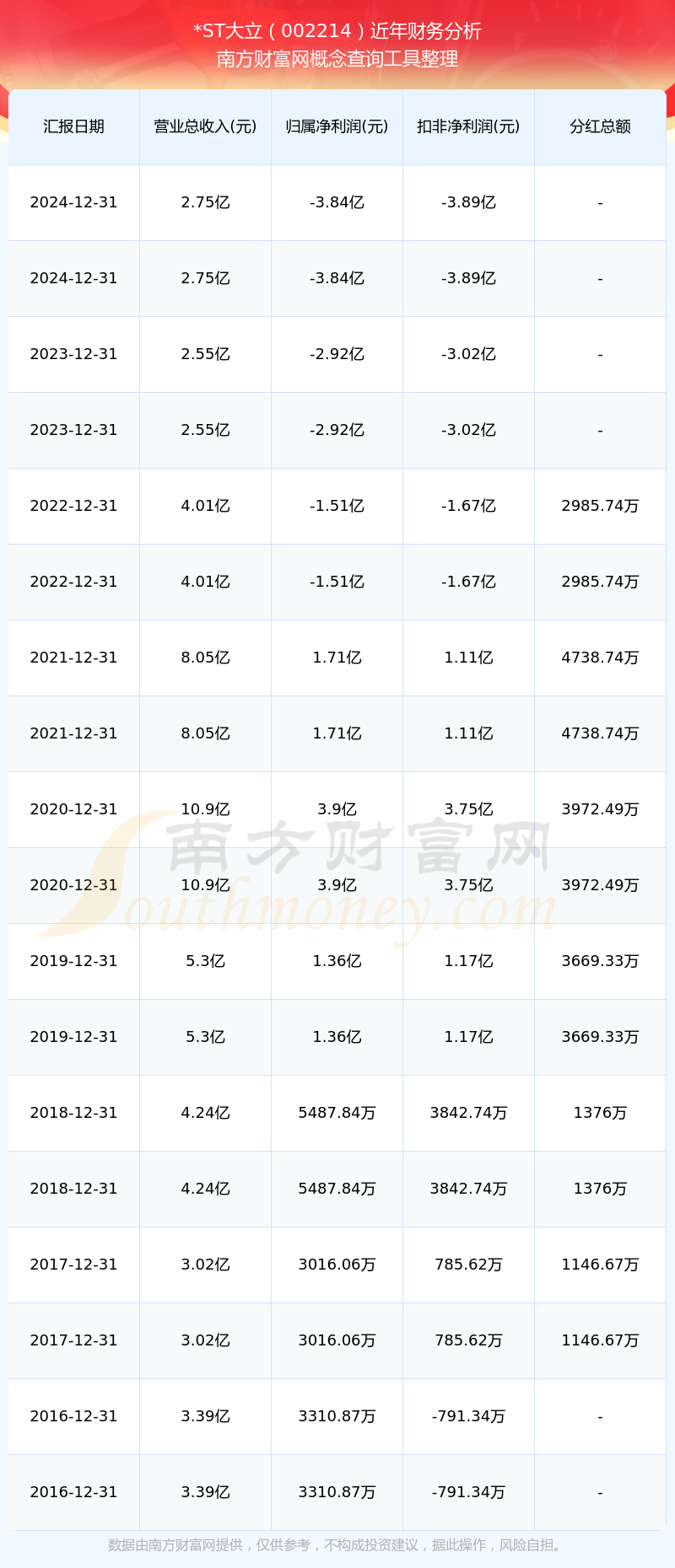 *ST大立歷年分紅派息情況如下表所示: