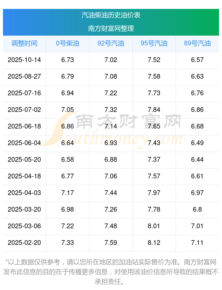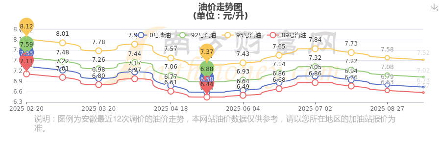 安徽安慶95號汽油10月24日最新價格為10月14日油價調(diào)整后的價格,具體為7.52元/升,相對上次調(diào)整時間8月27日的油價7.58元每升,共下調(diào)了0.06元,下調(diào)0.792%。下一輪油價調(diào)整時間10月27日24時,距離現(xiàn)在還有3.91天。