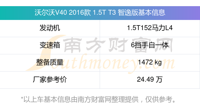 在動力上,沃爾沃V40 2016款 1.5T T3 智逸版配備的是一臺1.5T152馬力L4渦輪增壓發(fā)動機,匹配的是6擋手自一體自動檔變速箱,燃料形式為汽油,常規(guī)整備質(zhì)量1472kg,廠家參考價24.49萬元。