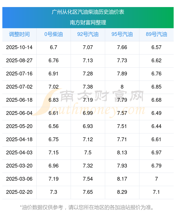 10月26日廣州從化區(qū)95號汽油歷史油價(jià)一覽表