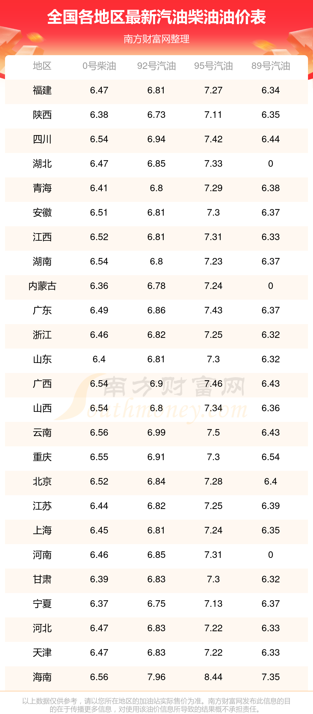 油價數(shù)據(jù)僅供參考,請以您所在地區(qū)的各加油站報價為準(zhǔn)。