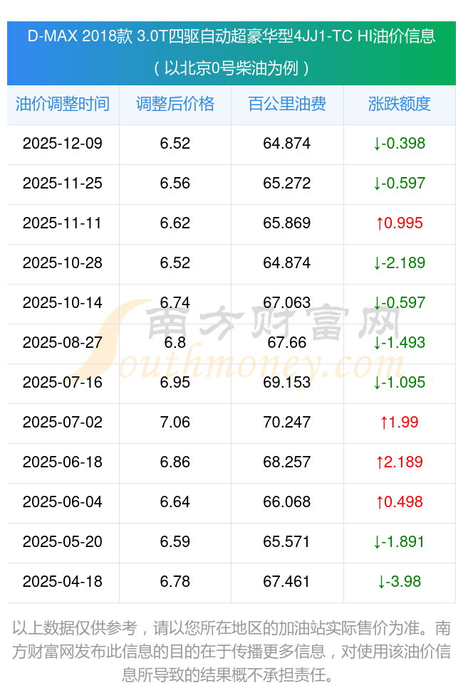 根據(jù)12月9日0號柴油最新調(diào)整價格6.52元/升來計算(以北京為例),該車型每百公里的平均油費(fèi)是64.874元,上一輪11月25日調(diào)整價格6.56元每升來計算,每百公里的平均油費(fèi)是65.272元,對比上一輪少花0.398元,下一輪的油價調(diào)整時間是12月22日24時。
