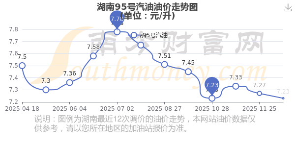 湖南汽油、柴油12月16日每升最新價(jià)格為12月9日調(diào)整后的價(jià)格,92號(hào)汽油為6.8元,跌了0.04元;95號(hào)汽油為7.23元,跌了0.05元;89號(hào)汽油為6.37元,跌了0.04;0號(hào)柴油為6.54元,跌了0.05元。