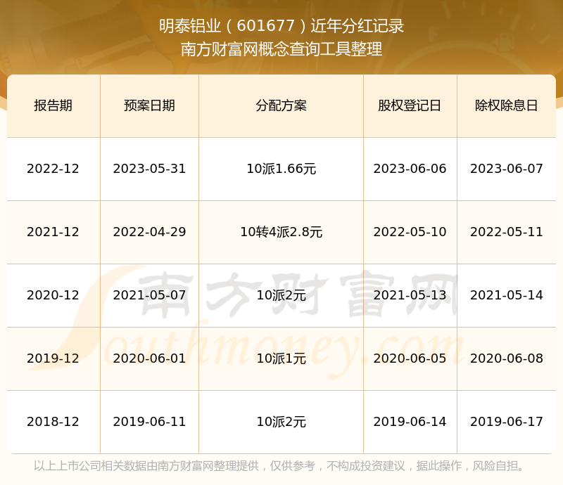 明泰鋁業(yè)最新一次公布的分紅方案為10派1.66元。本次權(quán)益分派股權(quán)登記日為2023年6月6日,除權(quán)除息日為2023年6月7日,派息日為2023年6月7日。