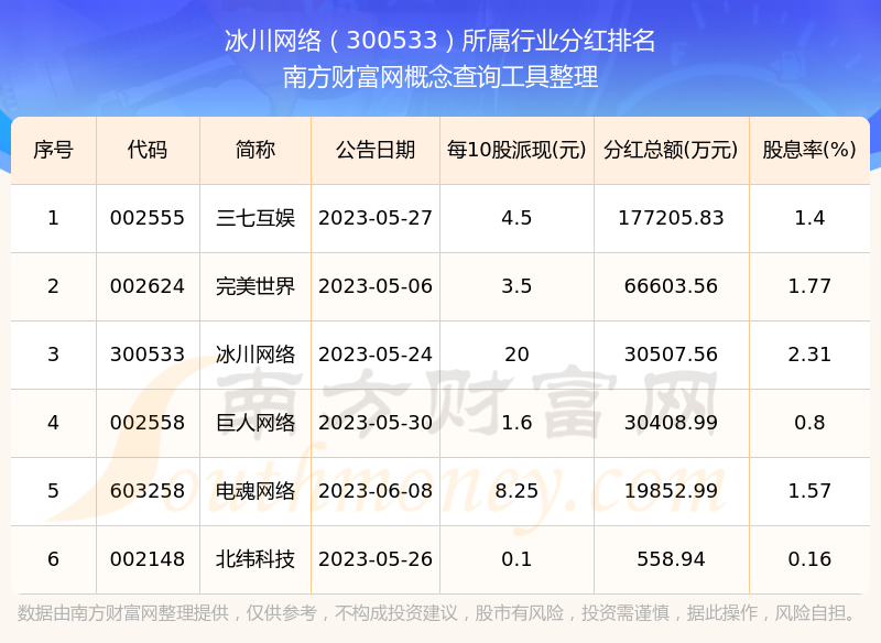 按照南方財(cái)富網(wǎng)趨勢(shì)選股系統(tǒng)統(tǒng)計(jì),冰川網(wǎng)絡(luò)所屬行業(yè)為網(wǎng)絡(luò)游戲行業(yè),網(wǎng)絡(luò)游戲行業(yè)分紅排名情況如下表: