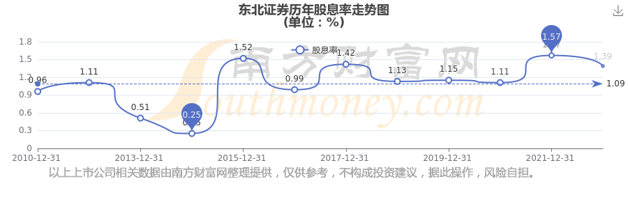 近年?yáng)|北證券年度股息率走勢(shì)如下圖: