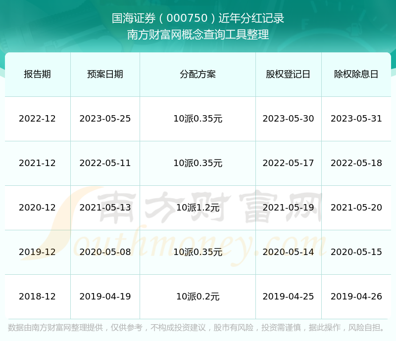 國(guó)海證券最新一次公布的分紅方案為10派0.35元。本次權(quán)益分派股權(quán)登記日為2023年5月30日,除權(quán)除息日為2023年5月31日,派息日為2023年5月31日。