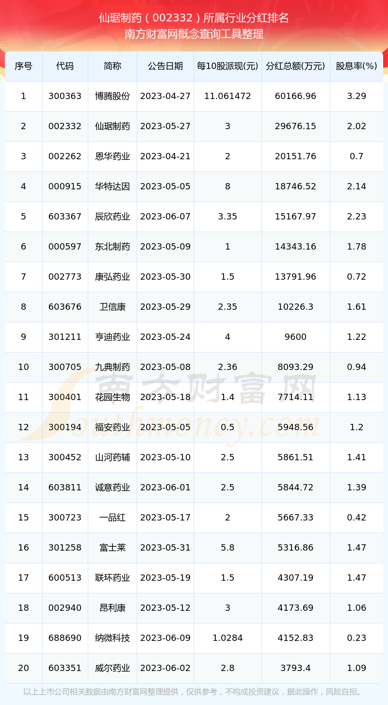 二、仙琚制藥002332行業(yè)分紅排名